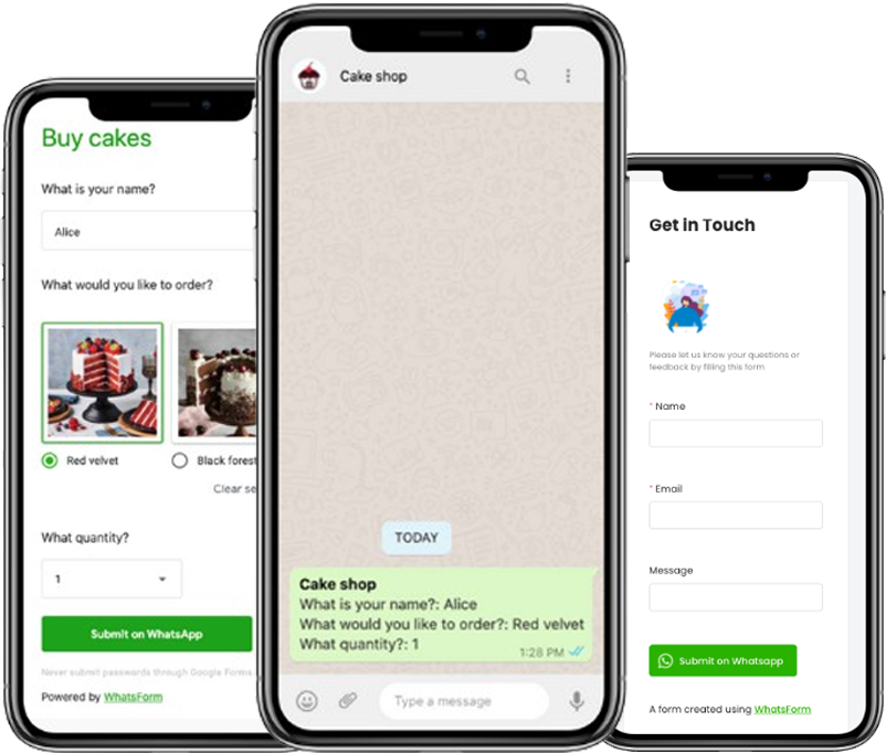 When a customer clicks on "Submit on WhatsApp" button in your WhatsForm, all the data filled by the customer will be send to WhatsApp using WhatsApp's API. If the customer is on his mobile browser, it will fire up WhatsApp app automatically. If customer is on the web app, it will route the messages to WhatsApp Web.